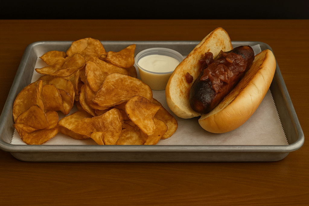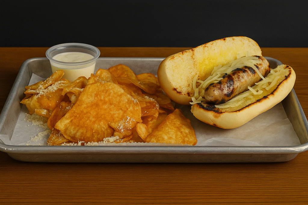 All brats & sausages are served with our homemade plain, spicy, parmesan chips