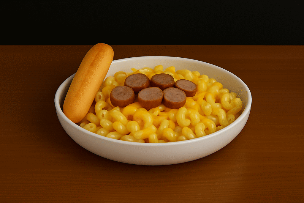 A GIANT bowl of cavatappi noodles smothered with our house made 6-cheese sauce topped with a chopped bratwurst