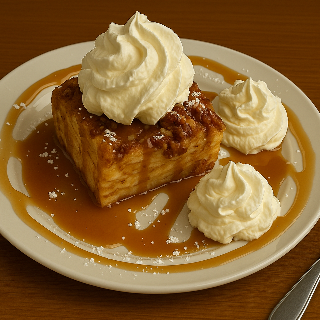 Pecan infused bread pudding served with maple bourbon sauce and whipped cream