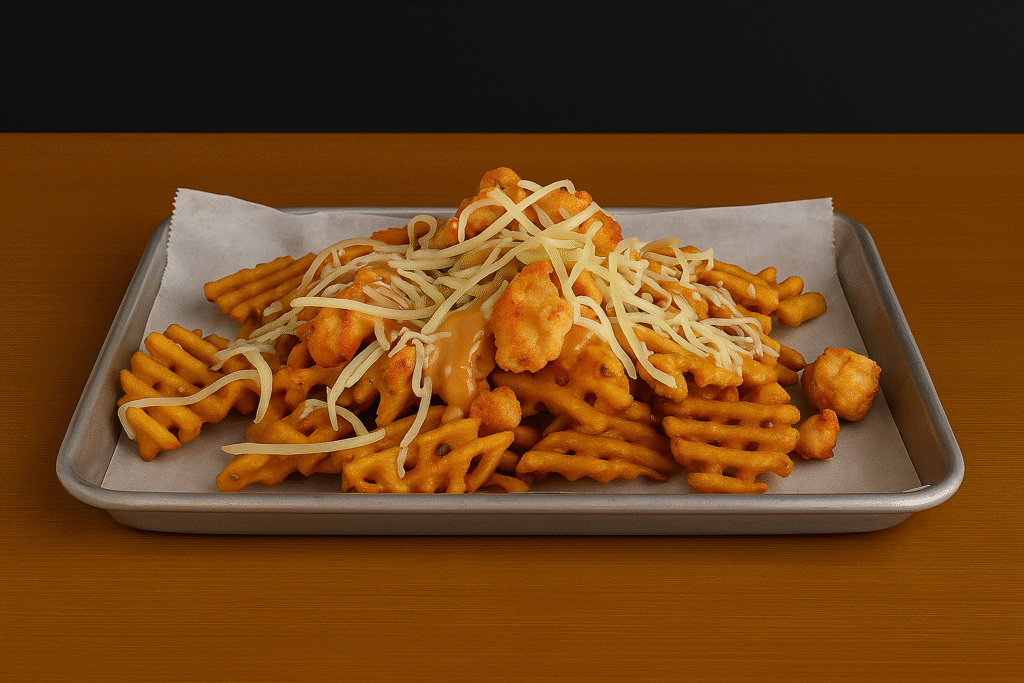 Waffle fries topped with fried and chopped chicken tenders with bacon and ranch
